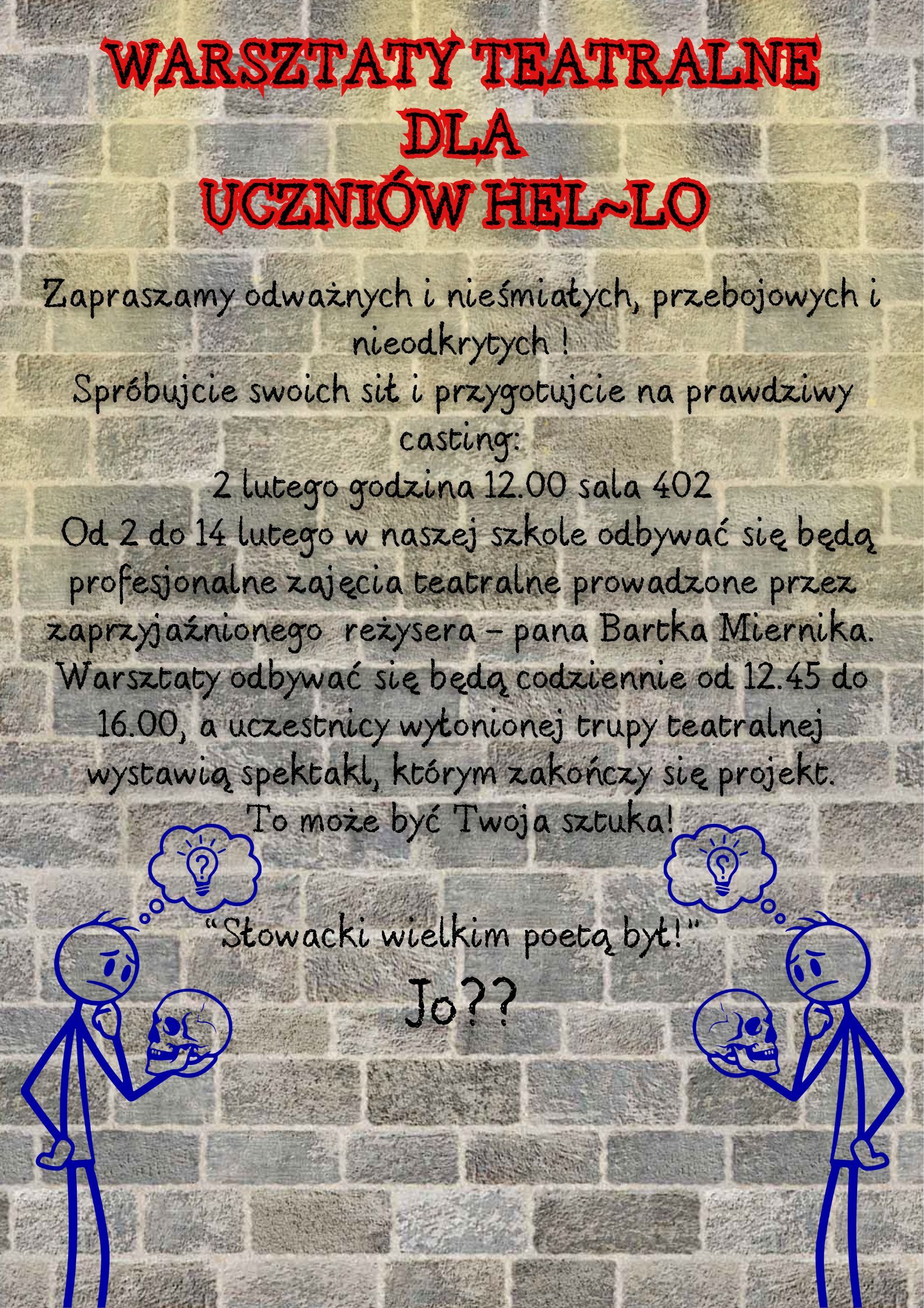 Od 2 do 14 lutego w naszej szkole odbywać się będą profesjonalne zajęcia teatralne prowadzone przez zaprzyjaźnionego reżysera - pana Bartka Miernika.