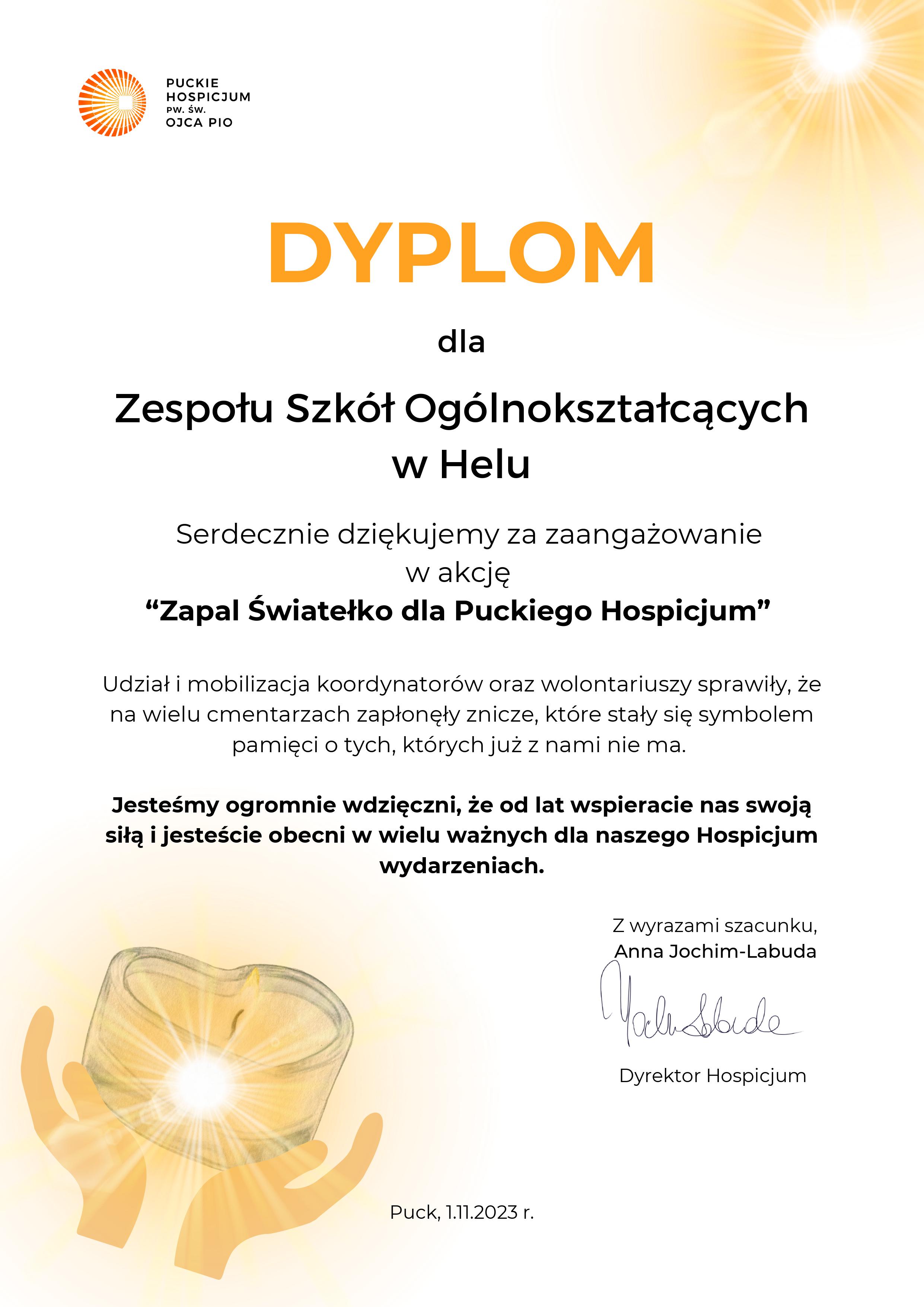 1. listopada to wyjątkowy dzień zadumy, wspominania bliskich, którzy od nas odeszli, zapalenia znicza na ich grobach, w miejscach ich pamięci. Tego dnia uczniowie – wolontariusze z naszej szkoły pod bacznym okiem koordynatora, ojca Bartłomieja z parafii pw. Bożego Ciała w Helu po raz pierwszy przyłączyli się do corocznej akcji „Zapal Światełko dla Puckiego Hospicjum”. Ubrani w charakterystyczne żółte koszulki, zaopatrzeni w puszki i znicze, kwestowali na cmentarzu komunalnym w Helu. Ich dobre serca, zapał do działania i szczere uśmiechy zaowocowały wyprzedaniem wszystkich otrzymanych zniczy oraz pełnymi datków puszkami. Łącznie helskie dzieci i młodzież zebrali dla hospicjum imponującą kwotę niemal 7000 zł! Jesteśmy z Was dumni!