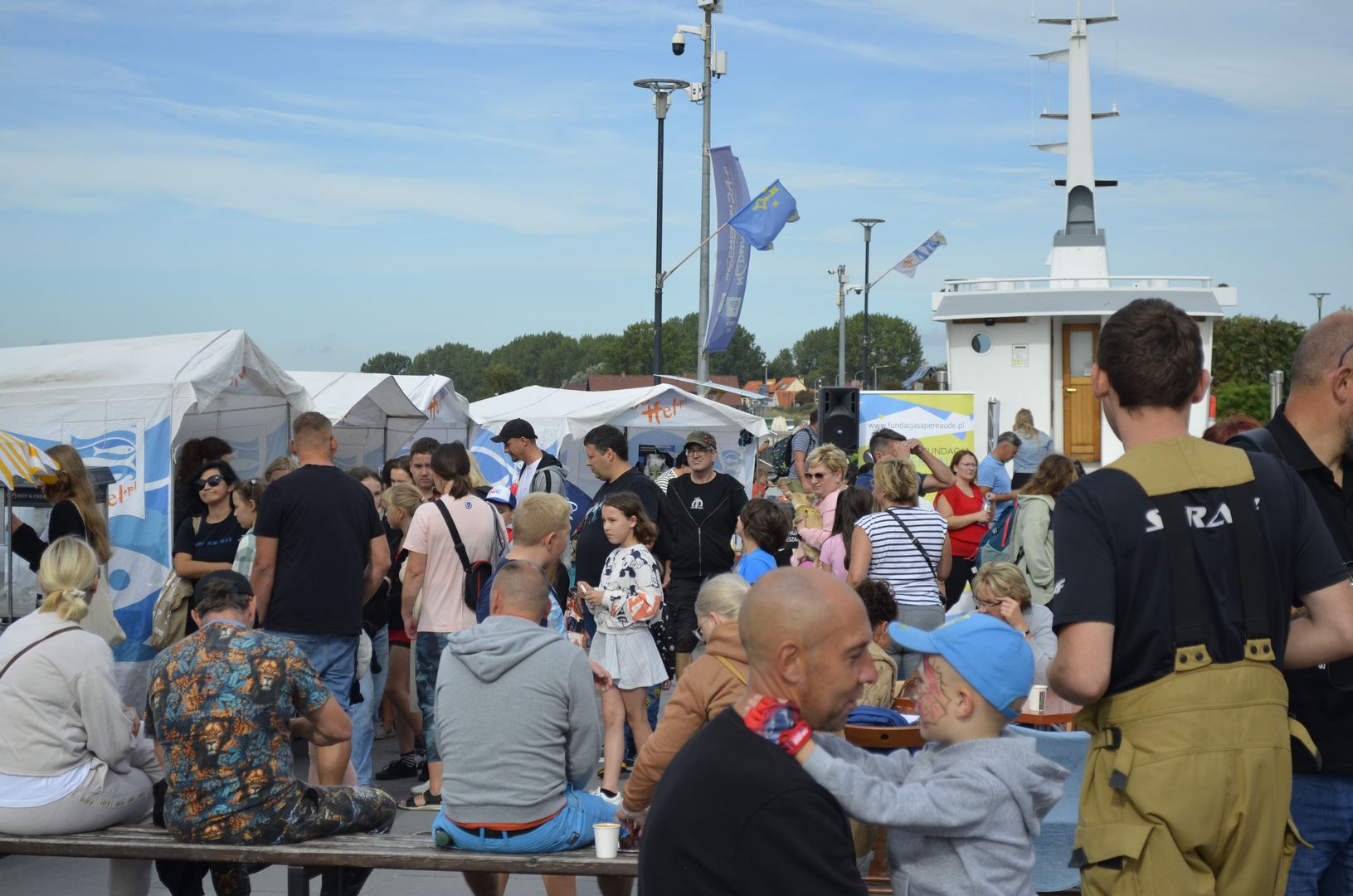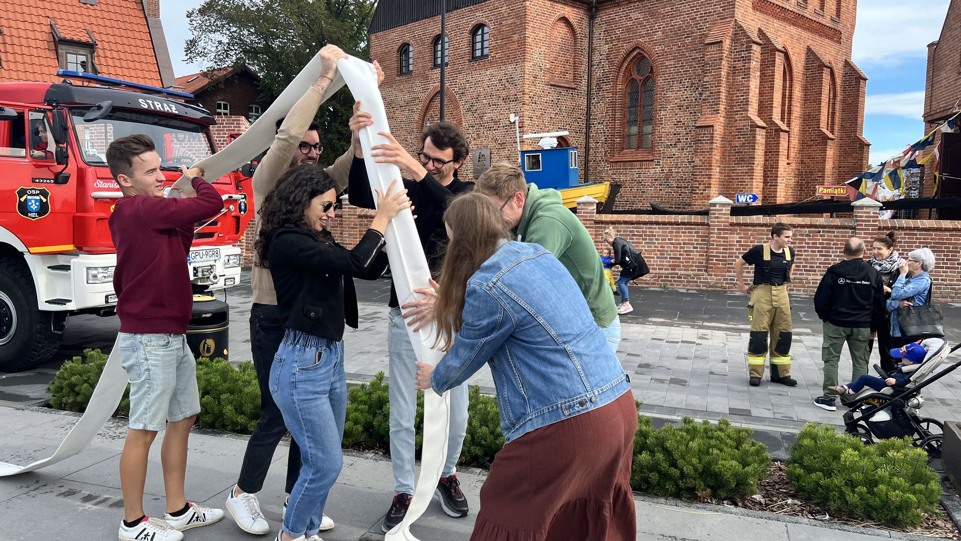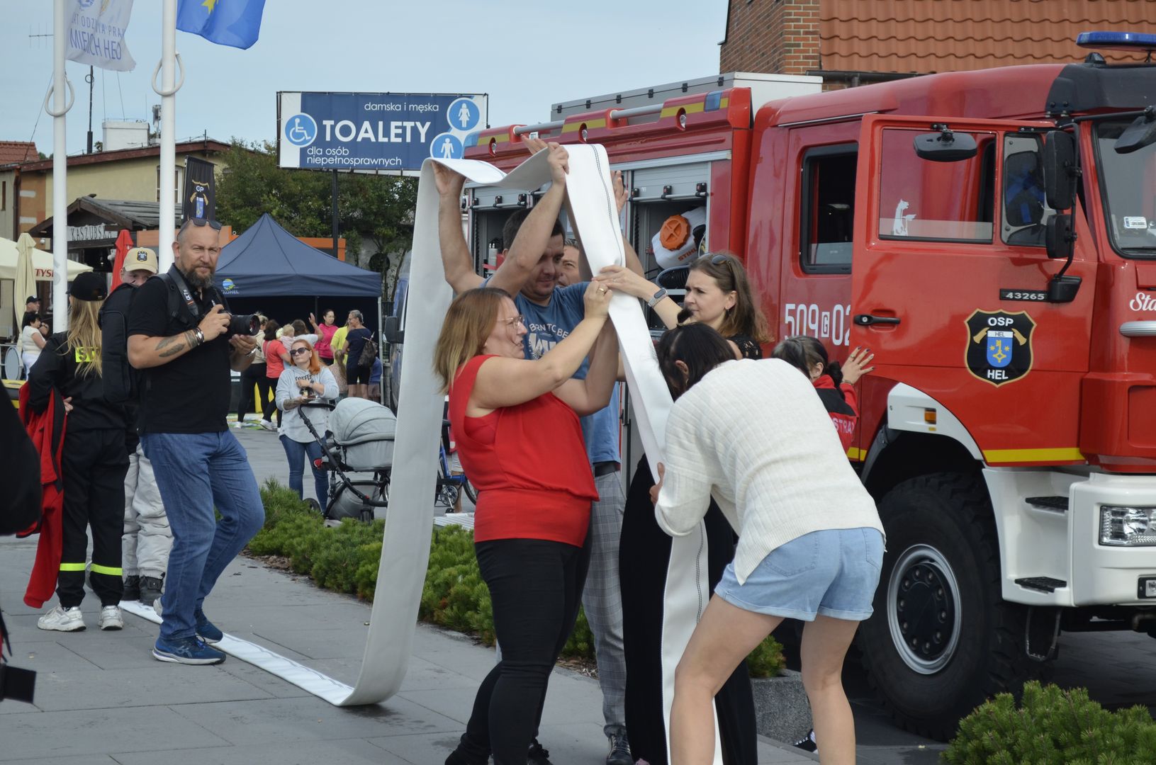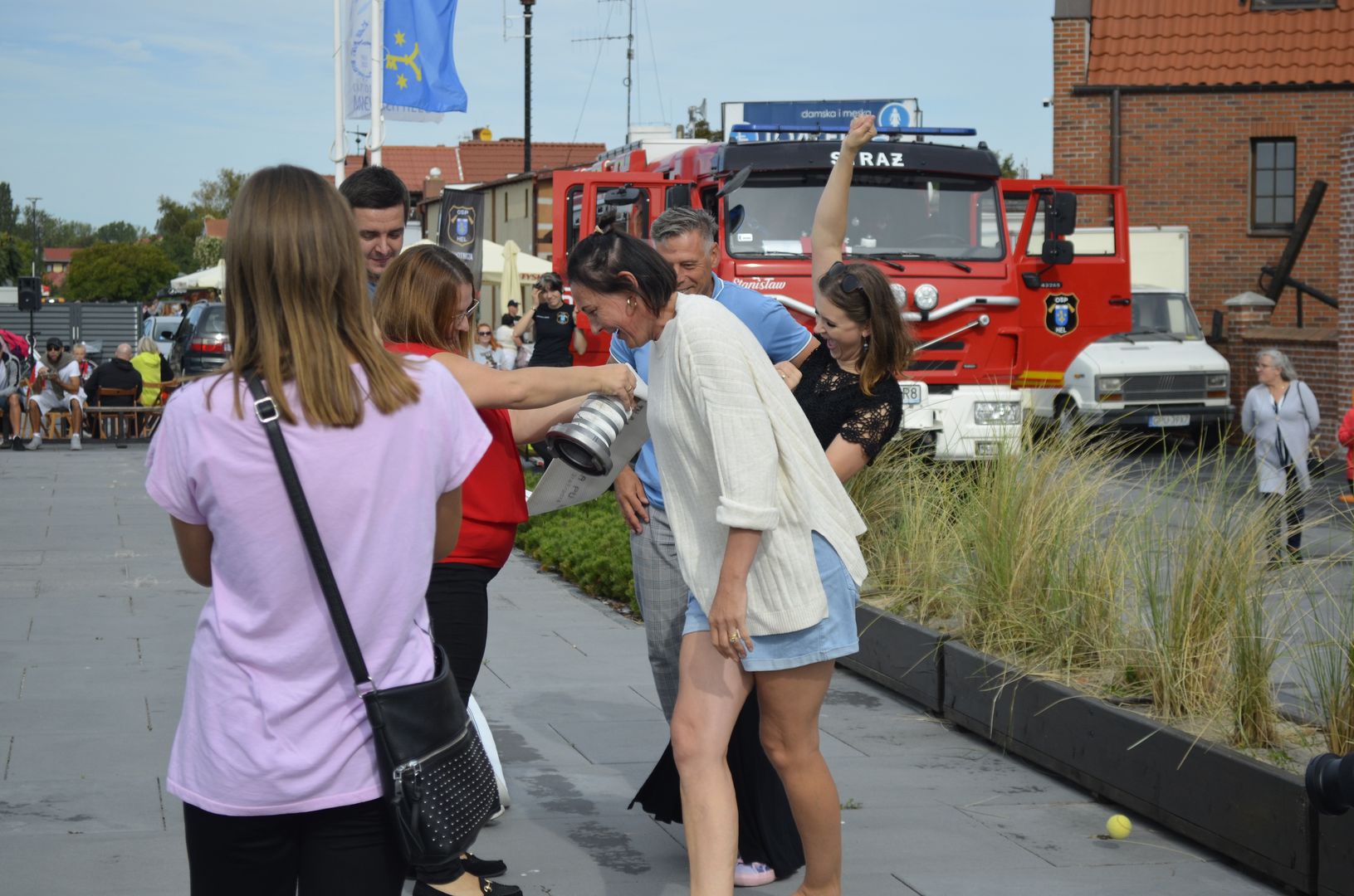 Odważni mogli stanąć w szranki konkursów sprawnościowych, które zorganizowała OSP Hel. Zawody w przesuwaniu piłki tenisowej przez wąż strażacki cieszyły się takim powodzeniem, że wielonarodowa grupa turystów przyłączyła się do nas i ku uciesze obserwatorów osiągnęła najlepszy czas.